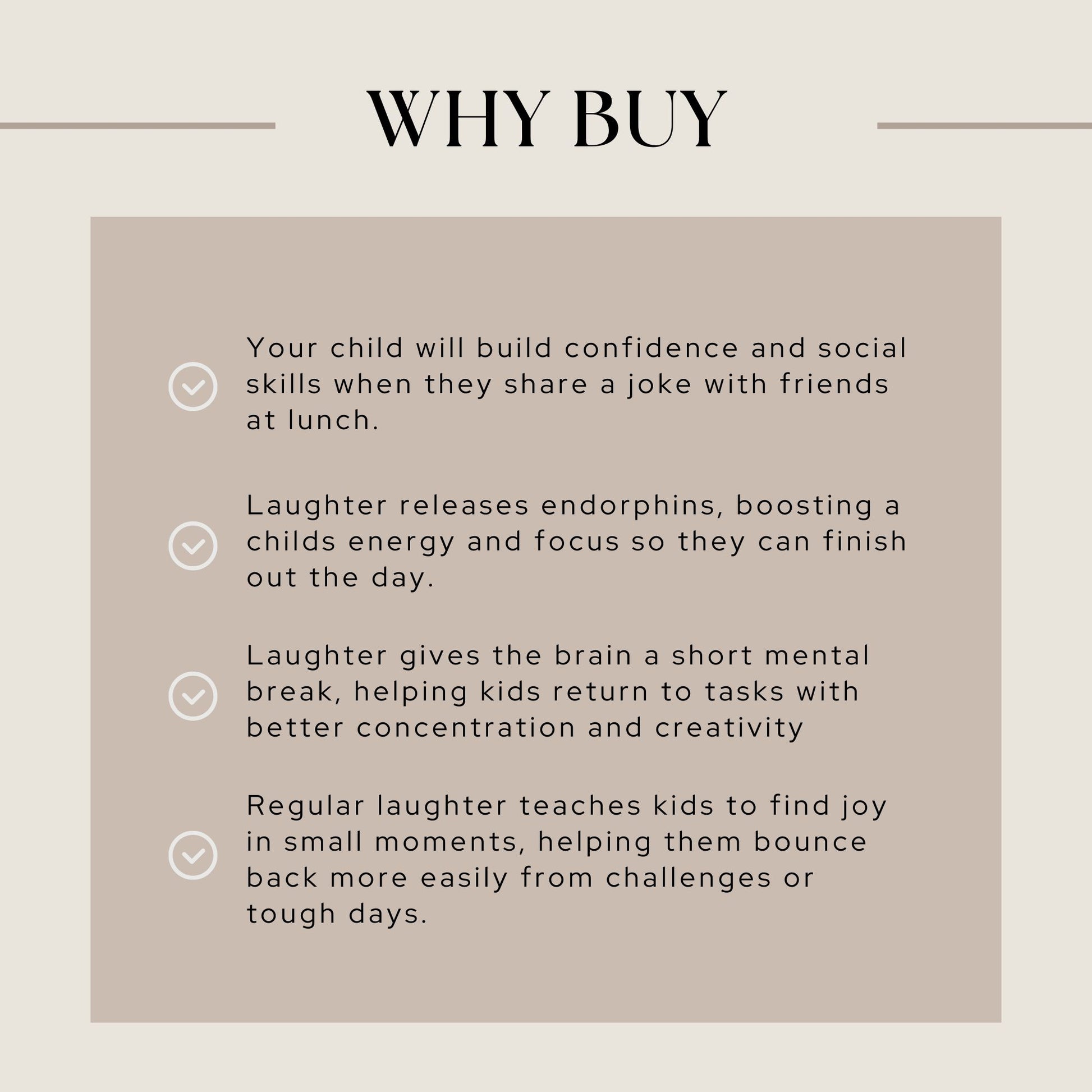 Lunchtime LOL is packed with 156 kid-friendly jokes designed to brighten your child’s day, spark smiles, and build confidence through laughter. These silly, clean jokes are perfect for lunchboxes, snack breaks, car rides, or anytime your child needs a quick mood boost. Encourage your little one to share a joke with friends at the lunch table, help them feel more connected, and make the school day fly by faster. Each joke is easy to read, age-appropriate, and guaranteed to bring a giggle every time.